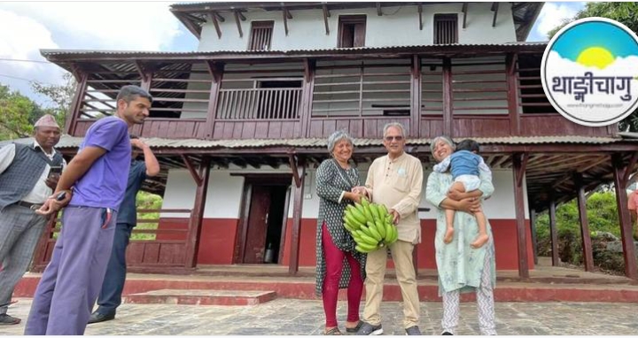 पुरानो घरको तिर्सना : गोरखा पालुङटार-१ स्थित भुइँचालोपछि रेट्रोफिट गरेको आफ्नो घरको आँगनमा बाबुराम भट्टराई परिवार । तस्वीर : बाबुराम भट्टराईको फेसबुकबाट ।