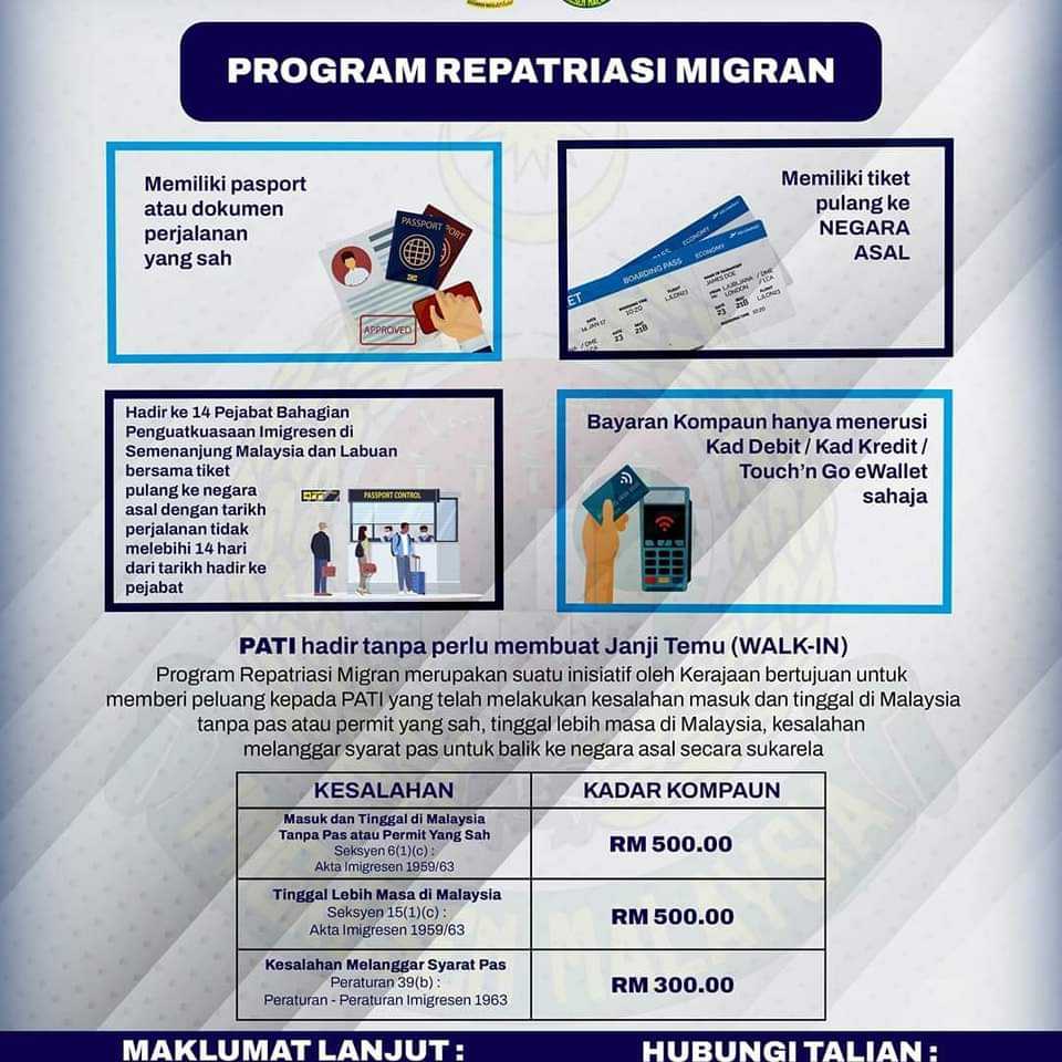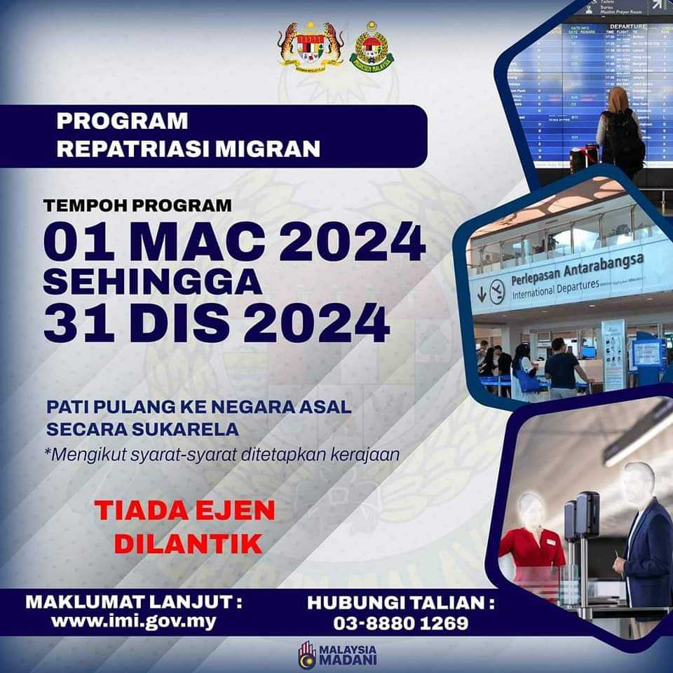 क्वालालम्पुर (मलेसिया):= “मलेसिया सरकारले गैरकानुनी हैसियतमा कार्यरत आप्रवासी कामदारहरुलाई स्वदेश फिर्ती कार्यक्रम सुरु गर्ने भएको छ । घरफिर्ती कार्यक्रम यहीँ मार्च १ तारिख देखि डिसेम्बर अन्तिम सम्म १० महिना सम्म खुल्ला गरेको अध्यागमन बिभागले जनाएको छ ।