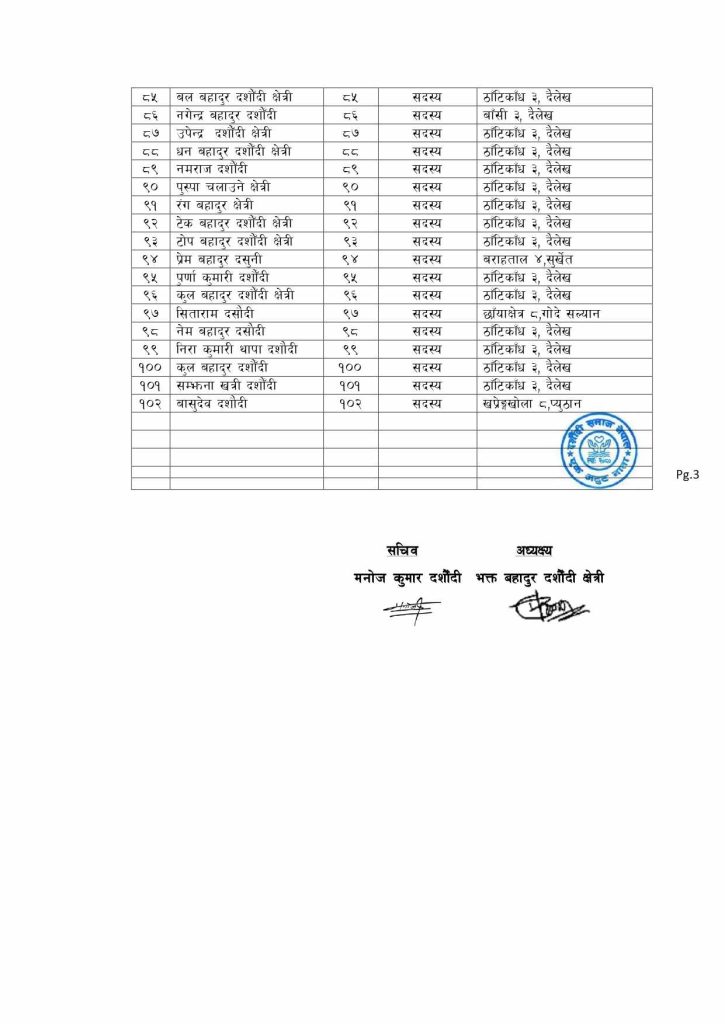 संस्थाले सल्लाहकार समितिका लागि नामहरु चयन गर्ने जिम्मा समाजका बरिष्ठ उपाध्यक्ष प्रकाश क्षेत्री, सचिव मनाेजकुमार दशाैँदी र सह-सचिव लाेकेन्द्र दशाैँदी लगायतकाे टिमलाई दिएकाे थियाे।