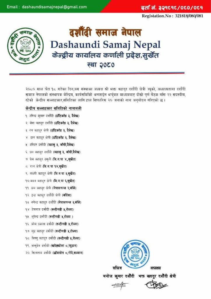 दशाैँदी समाज नेपालद्वारा केन्द्रीय सल्लाहकार समिति घाेषणा !!!