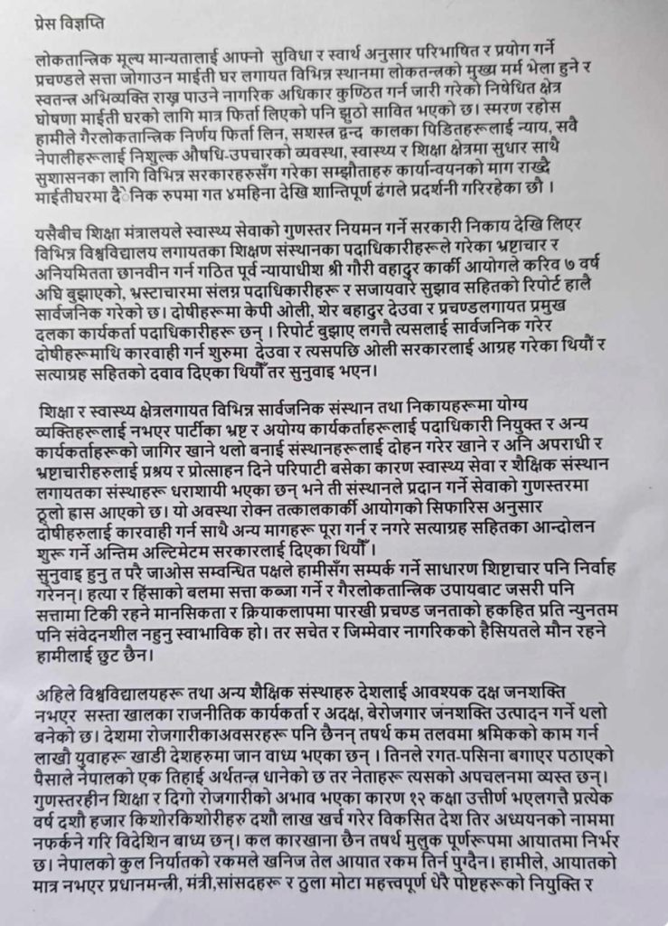 ‘हाल सत्ताको नेतृत्व गरेका प्रचण्ड त पदमा रहँदा सधैंभर आफ्नो दण्डहीनताका लागि सिंगो संक्रमणकालीन न्याय प्रक्रियालाई भद्दा मजाकमा परिणत गरेको इतिहास छ । त्यसैले निष्पक्ष रुपमा र पीडितहरुले न्यायको अनुभूति गर्ने गरी संक्रमणकालीन न्यायको प्रक्रिया नटुंगिउन्जेल पदमा बस्ने उनको कुनै पनि नैतिक तथा कानुनी धरातल छैन । तसर्थ उनले तुरुन्त राजीनामा दिनुपर्छ’, उनले विज्ञप्तिमा भनेका छन् ।