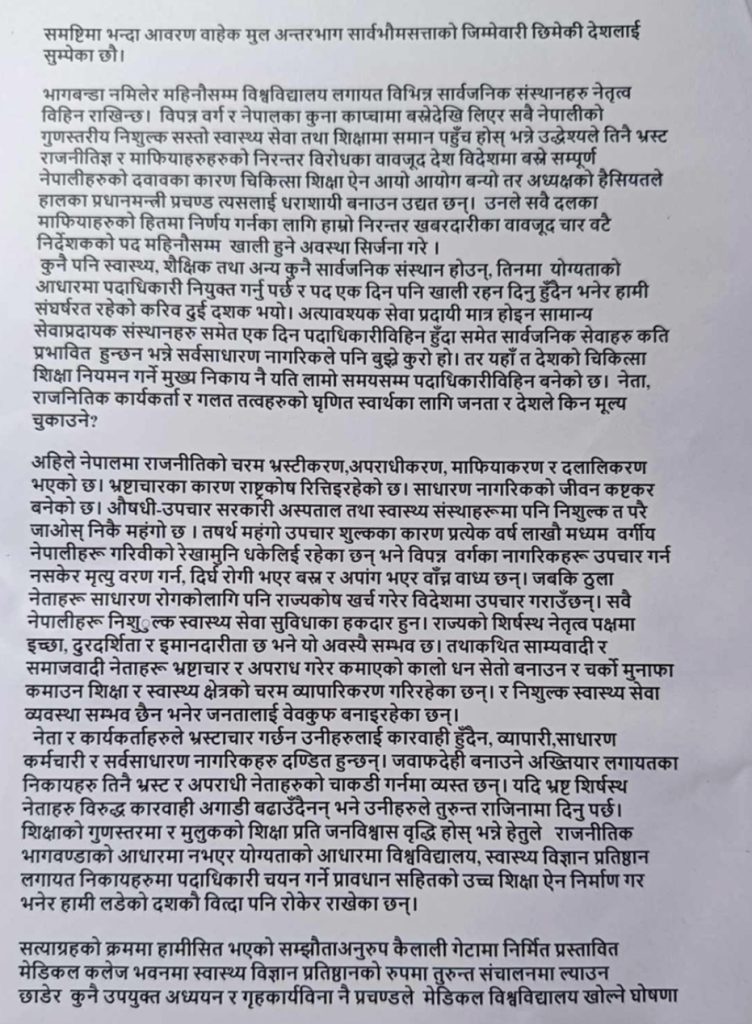 त्यस्तै विश्वविद्यालय र स्वास्थ्य विज्ञान प्रतिष्ठानका पदाधिकारी नियुक्ति मापदण्डसम्बन्धी उच्च शिक्षा ऐन र एकीकृत स्वास्थ्य शिक्षासम्बन्धी ऐन तुरुन्त पारित गर्न माग गरेका छन् । केसीले गौरीबहादुर कार्की आयोगले दोषी ठहर्‍याएका व्यक्तिहरुलाई कारबाही गर्न पनि माग गरेका छन् ।