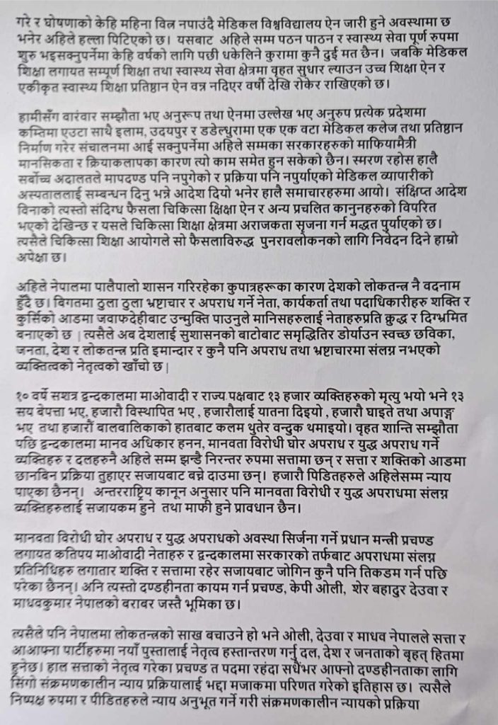 उनले अगाडि भनेका छन्, ‘त्यसैले नेपालमा लोकतन्त्रको साख बचाउने हो भने ओली, देउवा र माधव नेपालले सत्ता र आआफ्ना पार्टीहरुमा नयाँ पुस्तालाई नेतृत्व हस्तान्तरण गर्नु दल, देश र जनताको बृहत हितमा हुनेछ ।’