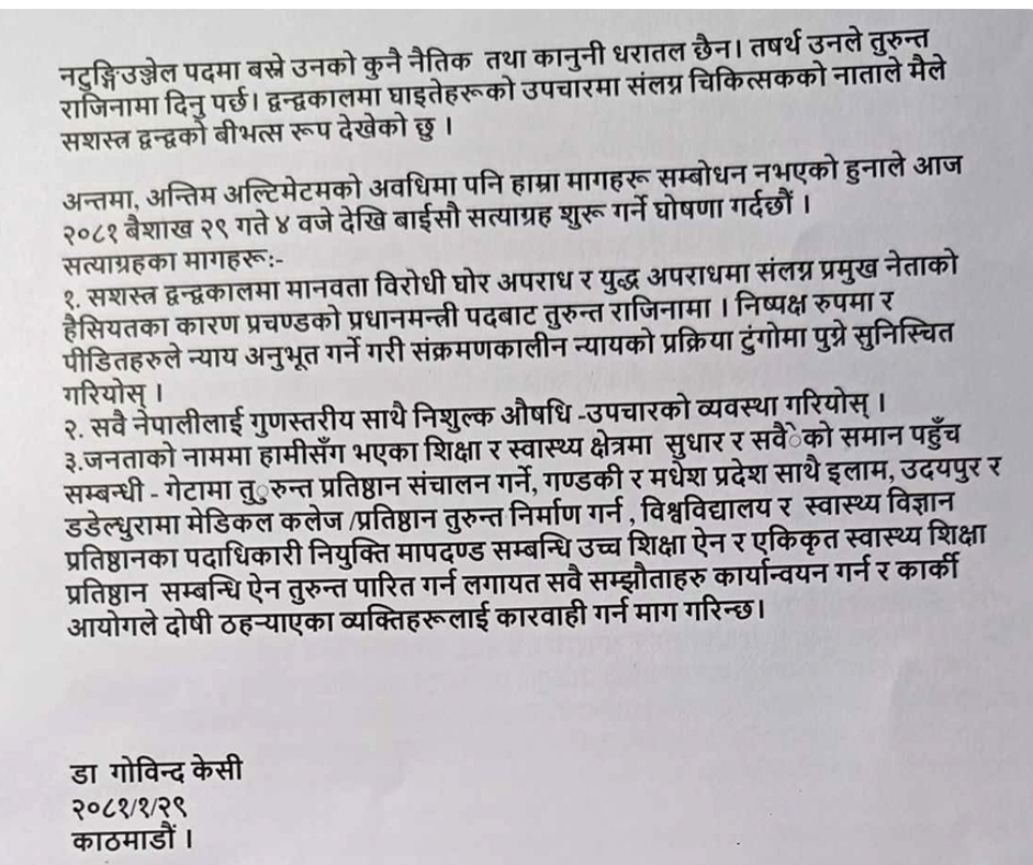२९ वैशाख, काठमाडौं । प्रधानमन्त्री पुष्पकमल दाहाल प्रचण्डको राजीनामा माग गर्दै डा. गोविन्द केसीले २२ औं पटक आमरण अनशन सुरु गरेका छन् ।