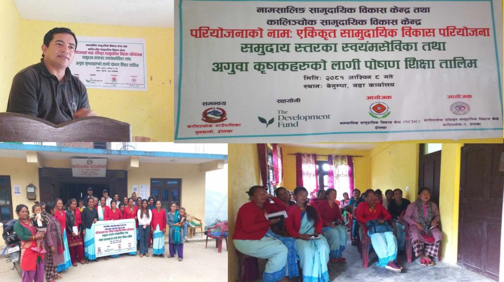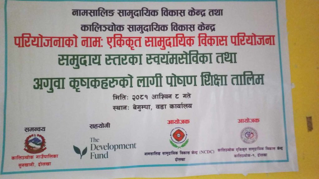 कालिञ्चोक, दोलखा — कालिञ्चोक एकीकृत सामुदायिक विकास केन्द्र र नामसालिङ सामुदायिक विकास केन्द्रको सामाजिक तथा प्राविधिक सहयोग तथा नर्वे विकास कोषको आर्थिक सहकार्यमा एकदिने पोषण शिक्षा तालिम भव्य रूपमा सम्पन्न भएको छ। यस तालिमको उद्देश्य स्थानीय समुदायलाई पोषण सम्बन्धी जानकारी प्रदान गर्दै उनीहरूको स्वास्थ्यमा सुधार ल्याउनु थियो। तालिममा स्वास्थ्य चौकीका इन्चार्ज रूपेस राय यादवले पोषणका महत्त्वपूर्ण विषयहरूबारे प्रशिक्षण दिएका थिए। उनले विशेष गरी समुदायमा हुने पोषणसम्बन्धी समस्याहरू र समाधानका उपायहरूबारे विस्तृत जानकारी दिए।