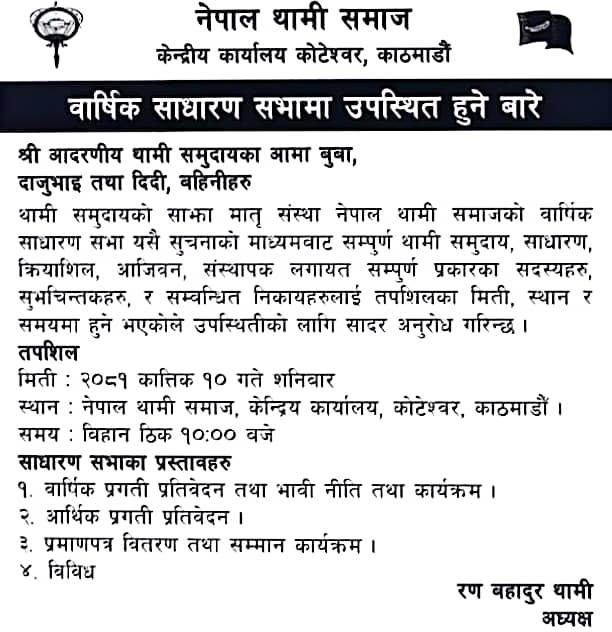 थामी समुदायलाई भव्य उपस्थितिका लागि आह्वान गर्दै यो सूचना सौर्य दैनिकमा प्रकाशित गरिएको छ। सभा २०८१ कात्तिक १० गते, शनिबार बिहान १०:00 बजे, संस्थाको केन्द्रीय कार्यालय कोटेश्वर, काठमाडौँमा हुनेछ।